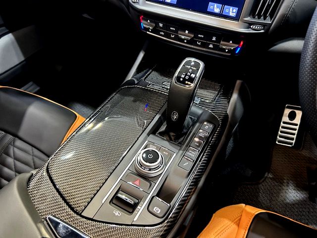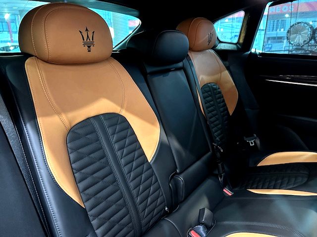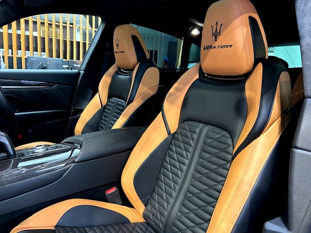内装はペール・テラコッタレザーを採用し、前席のヘッドレストには「トライデント」と「V8 Ultima」ロゴを刺繍。センターコンソールには限定車の証となる「una di 103」と印字されたバッヂが配されている。