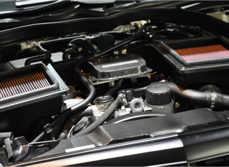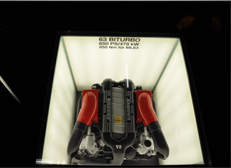 Eクラスのエンジンルームに積まれた6.3L V12ツインターボエンジン。 |